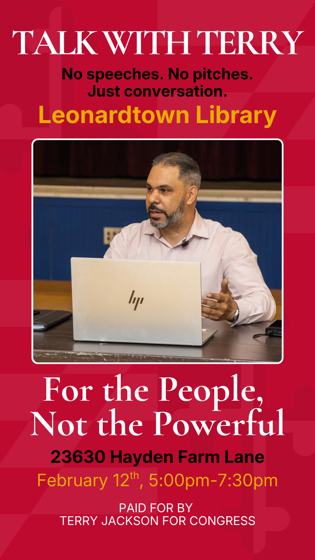 Feb 12 “Drive Thru the Five” Community Listening Session — LEONARDTOWN, MD Thursday, February 12, 2026 5:00 PM 7:00 PM Leonardtown Library (map) Google Calendar ICS View Event →